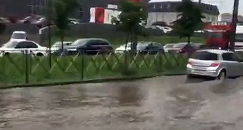 В паблике "Краснодар Движение" соцсети "ВКонтакте" сегодня опубликовано видео под названием "[Улица] Московская". На кадрах видна полностью затопленная проезжая часть, по которой едут автомобили.