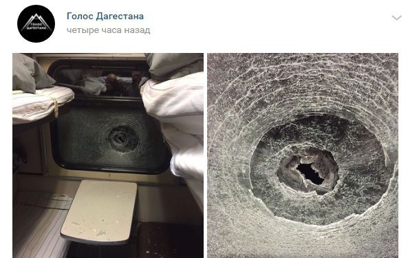 На опубликованном сегодня на странице паблика "Голос Дагестана" в соцсети "ВКонтакте" видео видно, что в результате попадания камня в одном из купе разбито окно.