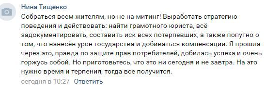 «Собраться всем жителям… найти грамотного юриста, всё задокументировать, составить иск всех потерпевших, а также попутно о том, что нанесён урон государства и добиваться компенсации», - прокомментировала Нина Терещенко.