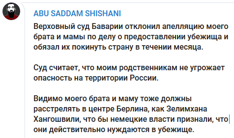 "Суд считает, что моим родственникам не угрожает опасность на территории России. Видимо, моего брата и маму тоже должны расстрелять в центре Берлина, как Зелимхана Хангошвили, чтобы немецкие власти признали, что они действительно нуждаются в убежище", - написал блогер.
