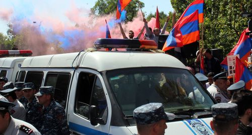 Участники шествия скандировали: "Кочарян - предатель!", "Да здравствует [премьер-министр] Никол [Пашинян]!", "Да здравствует революция!".Проезжающие мимо машины сигналили в знак солидарности. Полиция сопровождала шествие, не вмешиваясь.