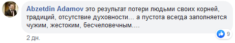 "Ценности поменялись, и виновато в этом старшее поколение - что посеешь, то и пожнёшь", - написал, в частности, Rabya Rabya. "Это результат потери людьми своих корней, традиций, отсутствие духовности... а пустота всегда заполняется чужим, жестоким, бесчеловечным", - высказал мнение Abzetdin Adamov.