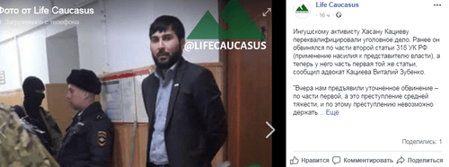 Следствие переквалифицировало обвинение ингушскому активисту Кациеву, сообщил адвокат Виталий Зубенко. "Предъявили уточненное обвинение – по части первой, а это преступление средней тяжести", - цитирует 19 октября адвоката "Кавказ. Реалии".