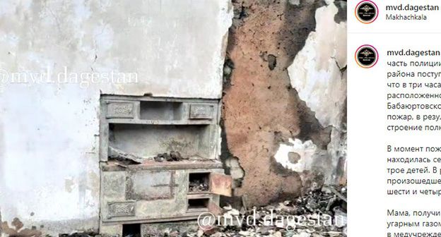"В момент пожара в доме находилась семья - женщина и ее трое детей. В результате произошедшего погибли двое детей шести и четырех лет. Мама, получившая отравление угарным газом, доставлена в медучреждение города Кизляр. Восьмилетний ребенок, который также пострадал в пожаре, с ожогами тела будет транспортирован в ожоговый центр в Махачкалу", - говорится в сообщении на странице ведомства в Instagram.