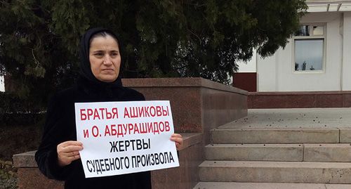 Она уверена, что братьев Ашиковых и Абдурашидова держат в заключении необоснованно. "Брата пытали, пугают. Я хочу, чтобы восторжествовала справедливость. Я вышла на пикет, чтобы власти обратили на это дело внимание и взяли его под свой контроль. Все происходит незаконно, а следствие только продлевает арест", - рассказала она.