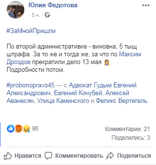 "Виновна, 5 тыcяч штрафа. За то же [...] за что по Максиму Дроздову прекратили дело 13 мая", - написала 20 ноября Юлия Федотова на своей странице в Facebook.