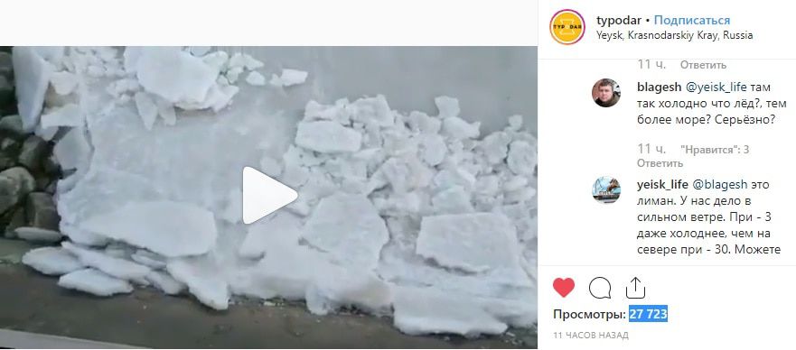 "Это лиман. У нас дело в сильном ветре. При -3 даже холоднее, чем на севере при -30… А мороз на выходных был до -10 при сильнейшем ветре, даже предупреждение от МЧС было", - написал пользователь yeisk_life.