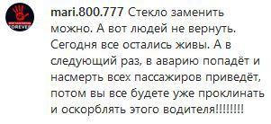 "Стекло заменить можно. А вот людей не вернуть. Сегодня все остались живы. А в следующий раз в аварию попадёт и насмерть всех пассажиров [...] потом вы все будете уже проклинать и оскорблять этого водителя!" – обратился пользователь mari.800.777 к участникам обсуждения, осудивших полицейского.