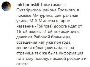 "То же самое в Октябрьском районе Грозного, в посёлке Мичурина, центральная улица, М-Х. Митаева (старое название - Гойгова), дорога идёт от 16-й школы, второй поликлиники, далее от районной больницы, освещения нет уже полгода, звонили, обращались, здесь на странице также была информация по этому поводу, никакой реакции и ответа", – написал, в частности, пользователь с ником michurinskii.