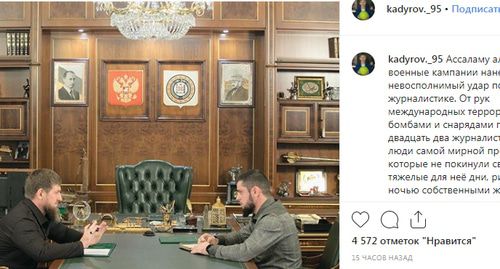 "Две военные кампании нанесли невосполнимый удар по чеченской журналистике. От рук международных террористов, под бомбами и снарядами погибли 22 журналиста. [...] Воскресным вечером [15 декабря] я встретился с помощником главы Чеченской Республики, директором ЧГТРК Ахмедом Дудаевым и поручил передать семьям погибших журналистов по 100 тысяч рублей", - написал глава Чечни.