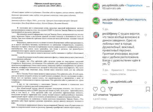 На официальной странице в Instagram ставропольского кафе утверждают, что Нанга неоднократно нарушал порядок в заведении. "Эжидиу Нанга является завсегдатаем Yes optimistic cafe", – говорится в сообщении от 12 декабря. Студент "успел зарекомендовать себя, в том числе в Yes optimistic cafe", как достаточно харизматичная личность, поведению которого характерен весь спектр эмоций южного свободолюбивого человека, переходящий порой грани дозволенного, установленные в цивилизованном обществе [...] Столкнувшись единожды с таким одиозным поведением Эжидиу Нанга, "Yes optimistic cafe" было принято решение ограничить доступ данного молодого человека в кафе", – отмечается в сообщении. По данным на 01.30 мск 18 декабря, 127 человек поставили под сообщением отметку "нравится".