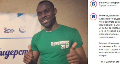 Студент из Африки Эжидиу Нанга, который уже пять лет учится в Ставрополе, рассказал, что его без объяснения причин не пускают в развлекательные заведения. "Меня не пускали, да. Много раз. Когда мы спрашивали, почему, отвечали – мы пускаем, кого хотим", привел 10 декабря его слова телеканал "Своё ТВ" на своем сайте. Нанга сказал, что в одном ночном клубе ему в первый раз отказали, потому что у него нет российского паспорта, во второй – просто сказали, что получили приказ его не пускать. Он считает, что его не пускают в заведения из-за цвета кожи, пишет со ссылкой на студента (издание, название которого "Кавказский узел" может сообщить по запросу).