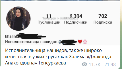 "Исполнительница нашидов, так же широко известная в узких кругах как Халима «Джаконда Анакондовна» Тепсуркаева", - написал он.