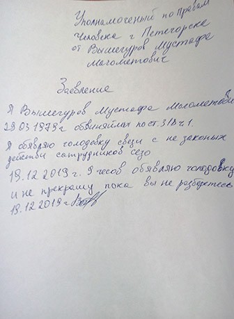 Мустафа Вышегуров сообщил корреспонденту "Кавказского узла", что сегодня объявил голодовку в знак протеста против требования сотрудников Пятигорского изолятора сбрить бороду. "Я человек религиозный, принципиально не сбриваю бороду. Мне не показали документ, где бы содержалось это требование. Со мной сидит еще человек - Адам Бадиев. Он тоже отказался брить бороду. Ему угрожали, что посадят на кичу (в карцер. - Прим. "Кавказского узла")", - рассказал Мустафа Вышегуров.