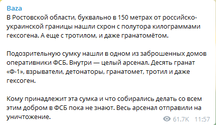 Строение, где располагался тайник, находится "буквально в 150 метрах от российско-украинской границы", написал 21 декабря Telegram-канал Baza.