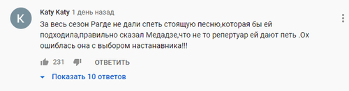 "За весь сезон Рагде не дали спеть стоящую песню, которая бы ей подходила... Ох, ошиблась она с выбором наставника!!!" - прокомментировала Katy Katy.