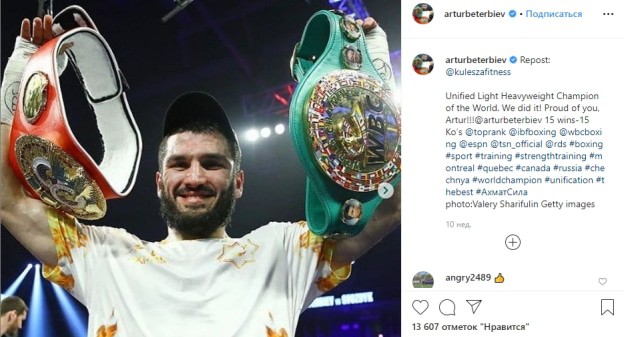 На своей странице в социальной сети "Инстаграм" Артур Бетербиев никак не прокомментировал сообщения о том, что он не желает ехать в Китай на поединок за звание чемпиона мира.