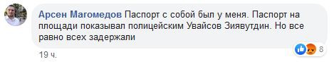 Арсен Магомедов в комментарии к этой публикации, размещенной также на странице Марата Исмаилова в Facebook, озвучил иную версию инцидента. "Паспорт с собой был у меня. Паспорт на площади показывал полицейским Увайсов Зиявутдин. Но все равно всех задержали", - написал юрист.
