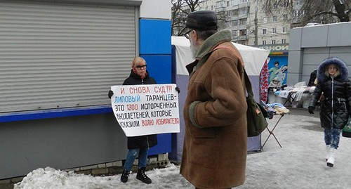 Активистка движения "Левый фронт" Татьяна Педан, член КПРФ Николай Попов и член регионального отделения Объединения перевозчиков России Ольга Пуршева провели сегодня одиночные пикеты рядом с автобусной остановкой "Кинотеатр Юность" в Краснооктябрьском районе Волгограда. Пикеты продолжались полтора часа. Активисты по очереди держали плакат: "И снова суд! Липовый ТаранцЕв – это 1300 испорченных бюллетеней, которые исказили волю избирателя".