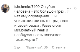 "Он убил человека - это большой грех. И нет ему оправдания. Он уничтожил жизнь сестры, свою и своей семьи. Разве стоит мимолетный гнев и необдуманность поступков таких жертв?" - прокомментировала ishchenko7409.