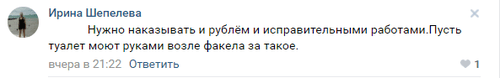 "Нужно наказывать рублем и исправительными работами. Пусть туалет моют руками возле факела за такое", - написала Ирина Шепелева.