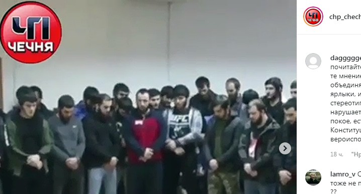Видео воспитательной беседы чеченских силовиков было опубликовано в группе Chp_chechenya (98,9 тысячи подписчиков) в Instagram вечером 23 января. На кадрах видно более двадцати молодых людей, которые стоят с опущенными головами. Камера также фиксируется на сидящих пожилых мужчинах, многие из которых тоже опустили взгляд вниз. Присутствующие слушают выступление силовиков, представителя власти и кадия, которые говорили на чеченском языке. За 19 часов пост набрал 2230 лайков и 71 комментарий.