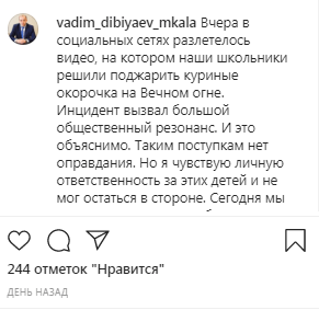 "Мы встретились с этими ребятами, с их родителями, учителями и директорами школ, в которых они обучаются", - написал 29 января на своей странице в Instagram Вадим Дибияев. Дети рассказали, что купили куриные окорочка, чтобы покормить котят в парке, а проходившие мимо люди посоветовал им немного поджарить мясо на Вечном огне, сообщил Дибияев. Школьники сказали, что один из прохожих лично продемонстрировал, как это сделать, а второй заснял это на видео, отметил чиновник.