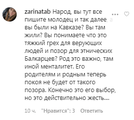 "Народ, вы тут все пишите: молодец и так далее, а вы были на Кавказе? Вы там жили? Вы понимаете, что это тяжкий грех для верующих людей и позор для этнических балкарцев? Род - это важно, там иной менталитет. Его родителям и родным теперь покоя не будет от такого позора", - написала сегодня пользователь zarinatab.