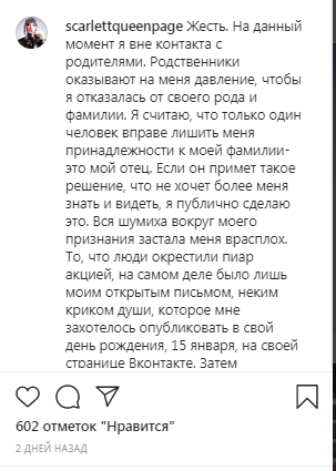 Шамиль Малкандуев сообщил о конфликте с родными после того, как сменил пол. "На данный момент я вне контакта с родителями. Родственники оказывают на меня давление, чтобы я отказалась от своего рода и фамилии", - написал 25 января Шамиль Малкандуев на своей странице в Instagram. Он также указал, что его решение о смене пола не было упущением в воспитании. "Моя идентичность к женскому полу была во мне, насколько я помню, лет с трех", - написал он. Под его постом по данным на 23.55 мск сегодня пользователи оставили 181 комментарий и 602 отметки "нравится".