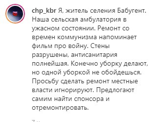 "Я житель селения Бабугент. Наша сельская амбулатория в ужасном состоянии. Ремонт со времен коммунизма напоминает фильм про войну. Стены разрушены, антисанитария полнейшая. Конечно уборку делают, но одной уборкой не обойдешься. Просьбу сделать ремонт местные власти игнорируют. Предлагают самим найти спонсора и отремонтировать", - говорится в сообщении на странице сообщества.