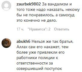Их оппоненты сочли самосуд неприемлемым. "Мы не в 10-м веке живём, все должно быть по закону", - написал, в частности, sssssss0000001. "За вандализм и того тоже надо наказать... а самосуд - это, конечно, не дело", - написал zaurbek9802. "Нельзя же так, братья, Аллах сам его накажет, тем более уже привлекли его работники полиции к ответственности за совершенный поступок", - обратился к участникам дискуссии abukh6.