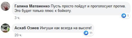 Под публикацией, по состоянию на 18.00 мск 13 марта, размещено 14 комментариев. Авторы части из них одобрили заявление тейпа. "Мужчины! Брависсимо!" – написал, в частности, Шамиль Ахмедов. "Ингуши, как всегда, на высоте!" - согласился Асхаб Озиев.