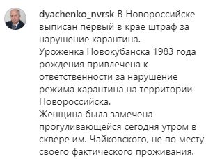 Женщине, которая гуляла в сквере Новороссийска без разрешительных документов, 2 апреля выписали первый в Краснодарском крае штраф за нарушение режима карантина.