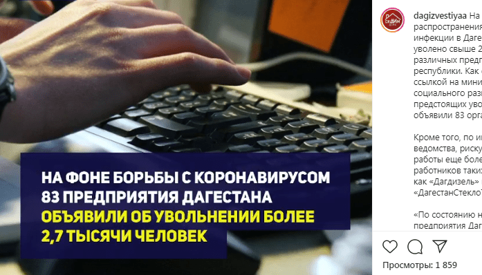 "Власти разрабатываются специальные меры, направленные на оздоровление рынка труда", - приводят сообщение министерства "Дагестанские известия" на официальной странице в Instagram, насчитывающей 1888 тысяч подписчиков. По данным на 10.00 мск сегодня под сообщением пользователи оставили 10 комментариев и 1859 отметок "нравится". Пользователи соцсети раскритиковали заявление ведомства, напомнив, что жителям обещали сохранить заработную плату за неделю вынужденного простоя во время эпидемии коронавируса.