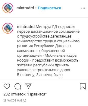 Ведомство также указало, что 3 апреля было подписано первое дистанционное соглашение о трудоустройстве дагестанцев совместно с общественной организацией "Мобильные кадры России", которое предоставит возможность жителям республики принять участие в строительстве дорог. "Намечена совместная деятельность по привлечению граждан от 18 лет для строительства сети скоростных автомобильных дорог Московской области и других регионов России", - говорится в сообщении, опубликованном на официальном сайте ведомства в Instagram, насчитывающем 21,3 тысячи подписчиков. По данным на 10.00 мск сегодня под сообщением пользователи оставили 10 комментариев и 232 отметки "нравится". При этом указывается, что заработная плата составит от 25 до 30 тысяч рублей и выше.