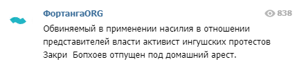 Активист обвиняется по статье о насилии в отношении представителей власти, опасного для их жизни и здоровья, в связи с протестами в Магасе, сообщил со ссылкой на пресс-службу Правозащитного центра "ОВД-Инфо".  Отметим, санкции статьи предусматривают до десяти лет лишения свободы.