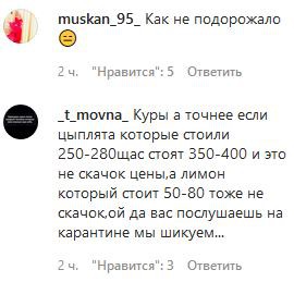 "Куры, а точнее, цыплята, которые стоили 250-280, щас стоят 350-400 и это не скачок цены? А лимон, который стоит 50-80 - тоже не скачок? Ой, да вас послушаешь, на карантине мы шикуем", - написал, в частности, пользователь _t_movna_.