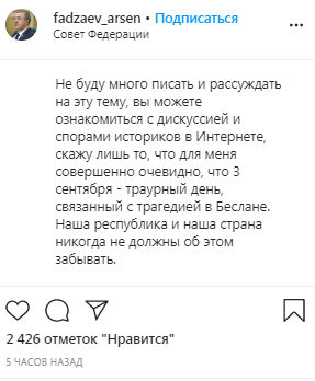 "Сегодня вопрос рассматривался в Совете Федерации [...] Для меня совершенно очевидно, что 3 сентября - траурный день, связанный с трагедией в Беслане. Наша республика и наша страна никогда не должны об этом забывать", - написал 17 апреля сенатор от Северной Осетии Арсен Фадзаев на своей странице в Instagram.  "Как представитель Осетии, не смог поддержать данное изменение и проголосовал "против", - подытожил он.