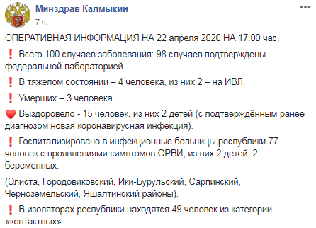 По данным Минздрава республики на 17.00 мск 22 апреля, в Калмыкии выявлено 100 случаев заболевания, 98 из них подтверждены федеральной лабораторией. В инфекционные больницы Элисты, а также Городовиковского, Ики-Бурульского, Сарпинского, Черноземельского, Яшалтинского районов республики госпитализированы 77 человек с симптомами респираторной инфекции, среди них двое детей и две беременных женщины. Состояние четырех пациентов оценивается как тяжелое, двое из них подключены к аппаратам искусственной вентиляции легких. Количество выздоровевших увеличилось до 15 человек, сообщило министерство на своей официальной странице в Facebook.