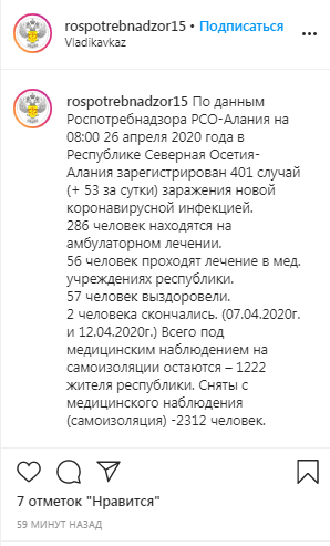 Как писал "Кавказский узел", к утру 25 апреля в Северо-Кавказском федеральном округе за сутки было зафиксировано 352 новых заражения коронавирусом, 30 из них - в Северной Осетии. Общее число зараженных в Северной Осетии к этому дню составило 305 человек.