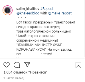 "Вот такой прекрасный̆ транспарант сегодня красовался перед травматологической больницей", - написал на своей странице в Instagram Салим Халитов под фото с изображением растяжки на фоне здания.