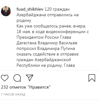 "120 жителей соседнего государства отправляются на автобусах домой, в Азербайджан", - написал на своей странице в Instagram врио главы Дербентского района Фуад Шихиев. Он отметил, что это "первый из нескольких этапов отправки жителей соседнего государства, отбывающих домой".