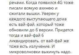 "Когда появился 4G тоже писали всякую ахинею и сжигали вышки. Уверен, у каждого выступающего дома есть вай-фай, который тоже обновили до 6-й версии. Придется тогда и вай-фай ликвидировать, от вай-фай же тоже есть излучение. И микроволновки выкинуть надо", - написал abu_ahmadik.