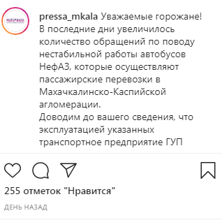 "В настоящее время по инициативе Минтранса РД обсуждается вопрос оказания помощи предприятию. В случае необходимости автобусы ГУП МПАТП-2 будут заменены на другие. Необходимо отметить, что и сегодня маршруты, закрепленные за данным предприятием, дублируются городскими троллейбусами и автобусами малого класса. Окончательное решение вопроса находится на контроле", – говорится 3 июня в сообщении на официальной странице пресс-службы мэрии Махачкалы в Instagram, насчитывавшей 74,2 тысячи подписчиков. По данным на 05.00 мск 4 июня сообщение набрало 255 отметок "нравится", его прокомментировали 103 раза.