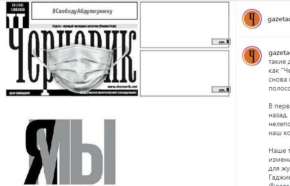 Напомним, в июне 2019 года три независимых дагестанских издания - "Новое дело", "Свободная республика" и "Черновик" - решили выпустить номера с одинаковой первой полосой в поддержку Гаджиева "Я/Мы Абдулмумин Гаджиев". "Так мы выразим протест и потребуем у судебных органов изменить меру пресечения редактору отдела "Религия" Гаджиеву на не связанную с лишением свободы", - заявил тогда главный редактор "Черновика" Маирбек Агеев.