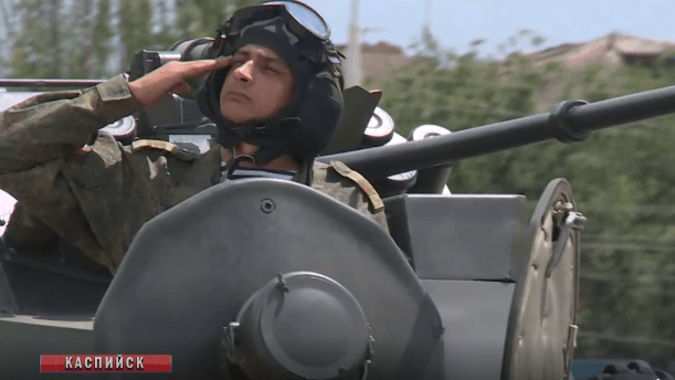 Репетиция парада Победы в Каспийске 20 июня 2020 года. Стоп-кадр видео РГВК "Дагестан", https://rgvktv.ru/obshchestvo/66763В сегодняшней репетиции приняли участие около 1,5 тысячи военнослужащих, 25 единиц военной техники и 10 самолетов и вертолетов, со ссылкой на заместителя командующего Каспийской флотилией Сергея Екимова передал ТАСС.