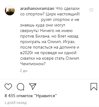 Пользователей Instagram возмутило перераспределение медали. "Ничего не имею против Биляла, но восемь лет назад проиграть на Олимпийских играх, после попасться на допинге, и в 2020 году, не проведя ни одной схватки на ковре, стать Олимпийским чемпионом?" - написал пользователь Instagram arashanovramzan под постом о решении МОК в отношении медалистов Олимпийских игр 2012 года в сообществе chechnyatoday_95, насчитывающем 296 тысяч подписчиков. По данным на 23.00 мск сегодня под сообщением пользователи поставили 528 отметки "нравится" и оставили 10 комментариев.