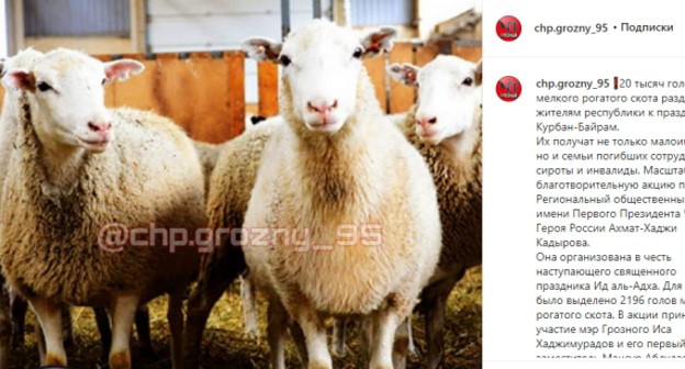 Видеоролик о раздаче малоимущим семьям Гудермесского района Чечни двух тысяч голов скота, размещенный в Instagram-паблике eldit_net, также был раскритикован пользователями соцсети. "И кто их (жертвенных овец. - Прим. "Кавказского узла") получил?" - поинтересовалась molli_lisa. "Одни и те же", - отметил magazin_95_grozny.