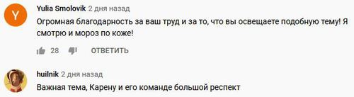 "О, Карен, да ты смелый мужчина. Такие вопросы поднимаешь. Моё уважение к Вам", – написал, в частности, "Фердинанд 4". "Очень тяжелая тема, но о ней нужно говорить. Спасибо за Вашу работу, Карен!" – написала Mia Serna.