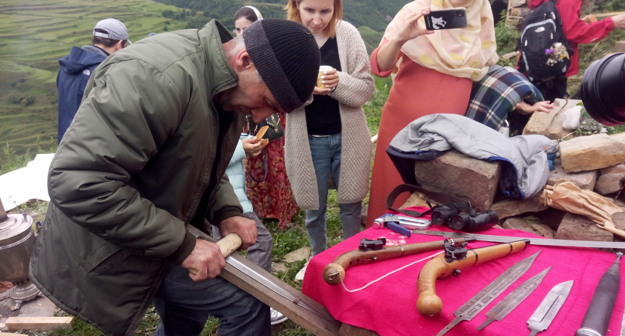 Во время мастер-класса кузнец делал клинок для восточного ножа. Своим делом Магомедов занимается уже 22 года. По его словам, в прежнее время в его селе занимались обработкой металла 5-6 семей, но сейчас только он с отцом. Вначале он делал сувенирную продукцию, но сейчас у него много заказов на эксклюзивные авторские ножи.